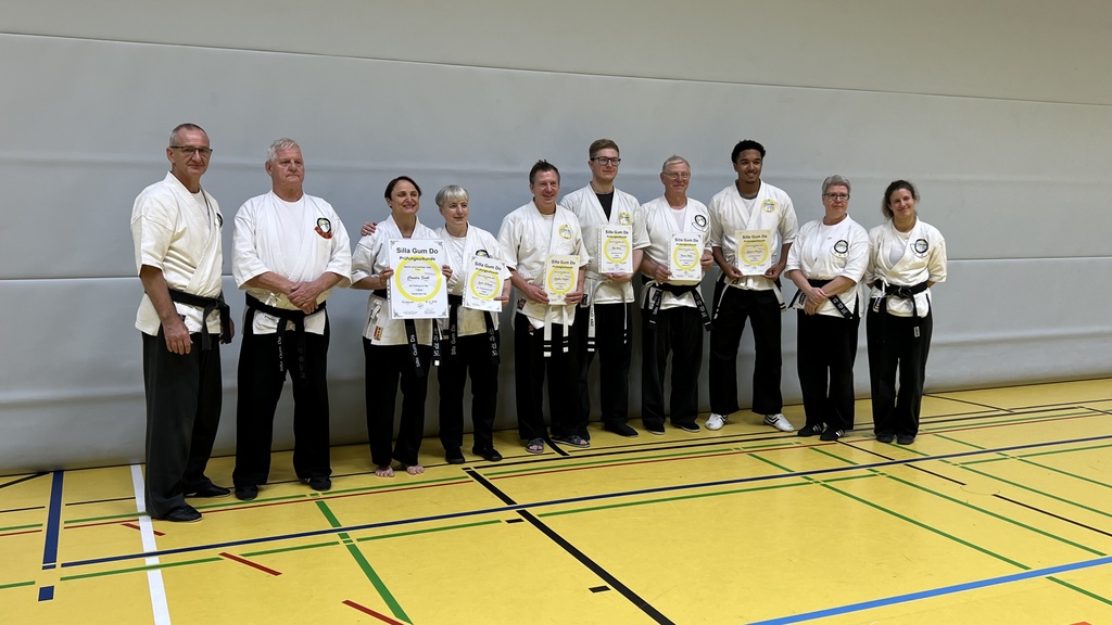 Geprüft wurden 4 Schülerinnen und Schüler auf den 3. Streifen (1. Kup) und den ersten Meistergrad (1. DAN), eine Meisterin auf den 1. Streifen zum 2. Meistergrads (1.DAN-1.TP) und ein Teilnehmer auf den 2. Streifen zum 2. Meistergrad.